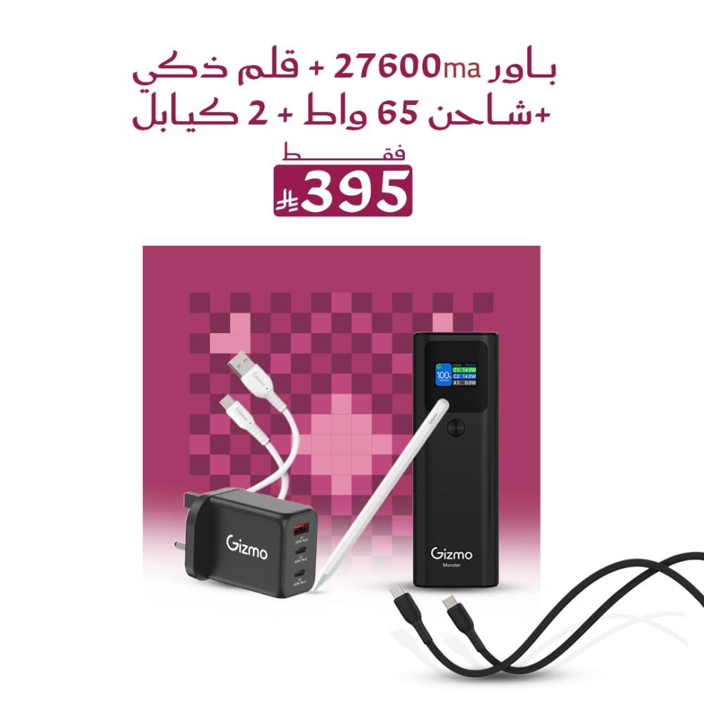 بكج التوفير من قيزمو | باور 27600 ملي امبير و شاحن 65 واط و قلم ايباد معتمد من أبل و 2 كيابل