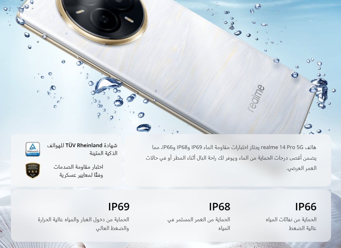 يوفر realme 14 Pro قوة محسّنة وحماية فائقة ضد السقوط، حيث اجتاز بنجاح شهادة TÜV Rheinland للهواتف المتينة واختبار مقاومة الصدمات بالمستوى العسكري.