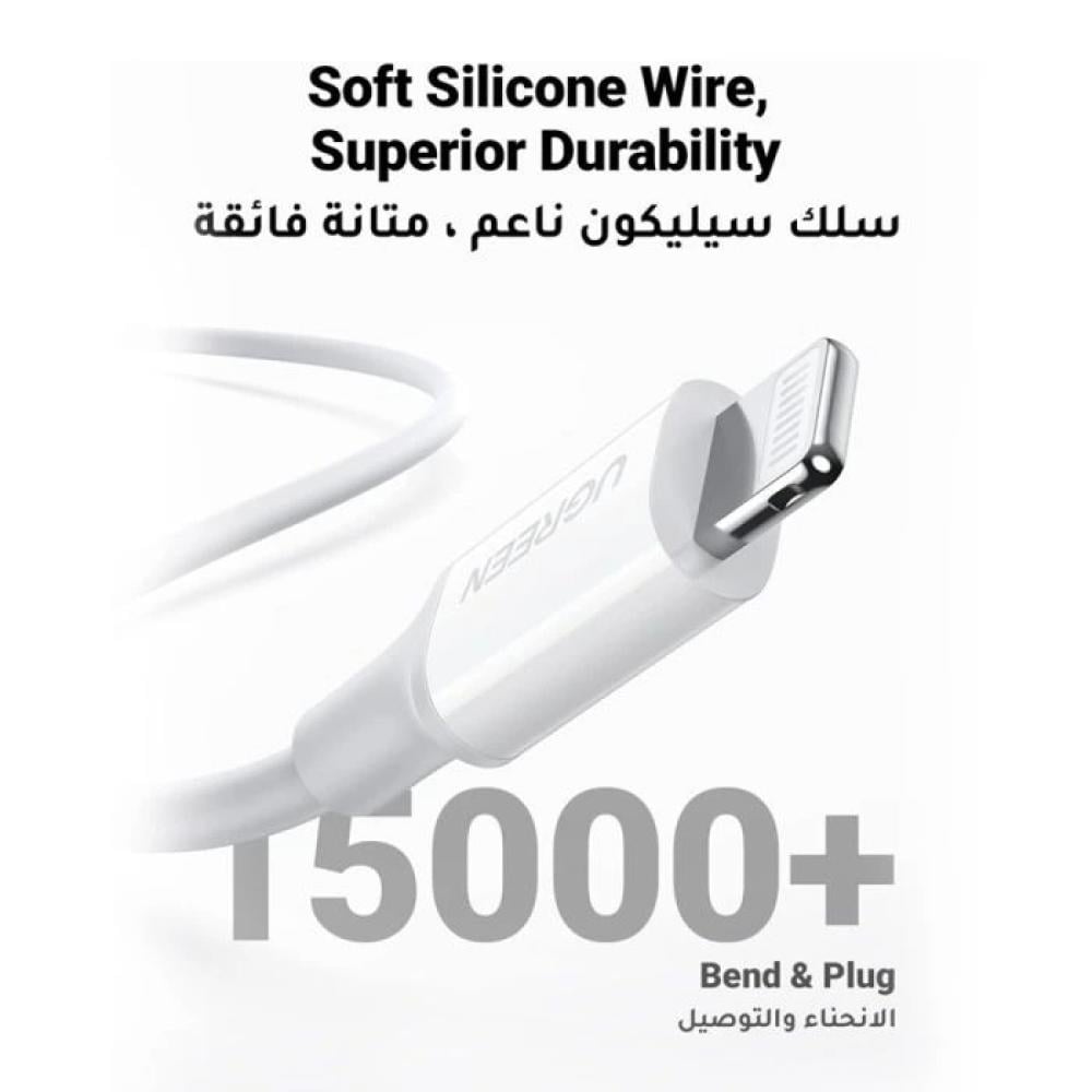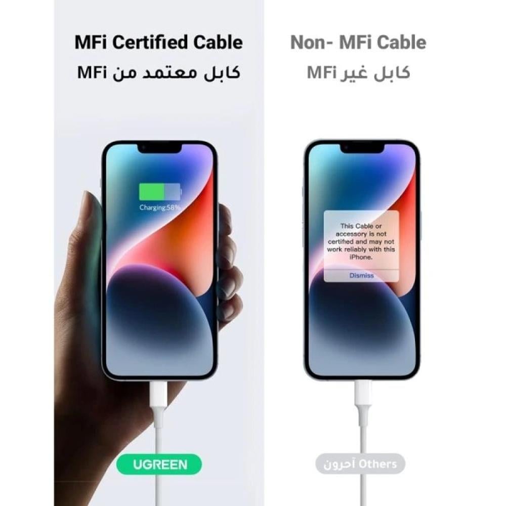 كيبل شحن سريع معتمد من ابل: مصمم بشريحة معتمدة من ابل، يضمن كيبل الشحن بمنفذ USB نوع C إلى لايتنينج لجوال ايفون من يوجرين التوافق بنسبة 100% للشحن السريع والمزامنة لجميع أجهزة ايفون لايتنينج ذات 8 دبابيس. عدم وجود رسالة تحذيرية مُنبثقة.