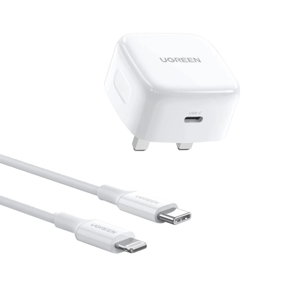 يوجرين - شاحن جداري بمنفذ USB-C وبقوة 20 واط مع سلك شاحن ايفون إلى USB-C - أبيض